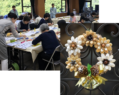 2018年12月8日(土)に京都府立植物園で「しめ飾りリース作り体験教室」を開催し、男女40名超の方々にご参加いただきました。華やかさを演出する着色したものや素材の色を生かした、カボチャやゴーヤ、キャベツなどのタネでかたどった花をあしらい、水引、松、タッセルなどを飾り付けたクリスマスからお正月まで楽しめる「しめ飾りリース」を制作。皆さま満足そうな笑顔で完成品を手に、また来年も参加したいとの声をたくさんいただきました。