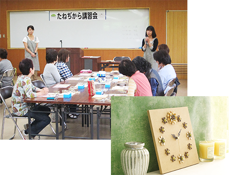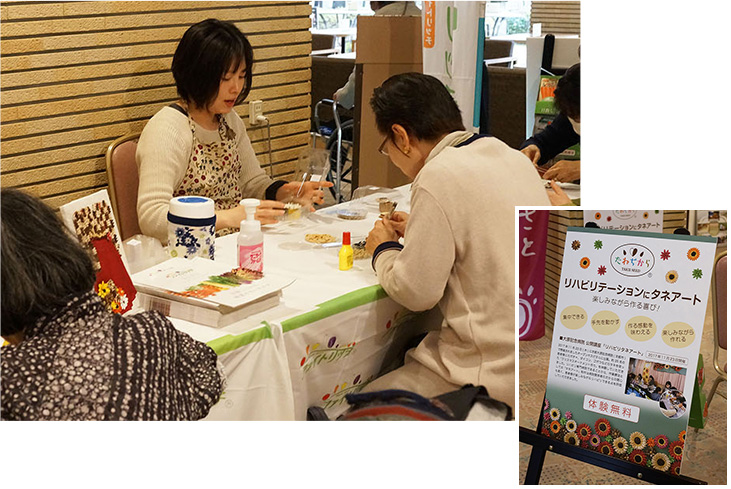 2018年3月4日(日)に平安会館(京都市)で、京都府及び京都大原記念病院グループ共催企画「目指せ!生涯活躍のまち」が開催され、たねぢからプロジェクトは「メモクリップ体験教室」を開催しました。メッセージカードや写真を飾れるスタンド型メモクリップに、カボチャやスイカ等のタネで作った花を装飾しました。リハビリにもなるタネアートとして、多くのお客様から関心が寄せられました。