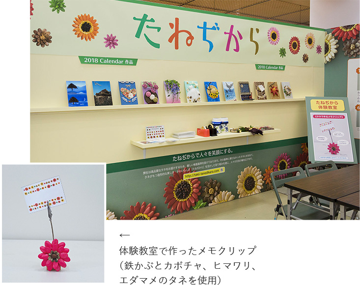 2018年1月18日(木)・19日(金)に京都市勧業館「みやこめっせ」で例年行われているタキイの商談会「園芸フェア」が開催され、たねぢからプロジェクトは作品展示とメモクリップ制作体験会を催しました。2018年版カレンダー作品の展示にはお客様からの感嘆の声も多数聞かれ、熱心に撮影される方もおられました。数種類のタネで花をかたどり装飾したメモクリップを制作する体験会は、最終終了時間のみ設定し随時受け付けるフリー参加スタイルでしたが、空く席を並んで待つ方がおられたり、参加されるお客様が途切れることがないほど盛況でした。男女問わず、熱心に取り組んでいただき、2日間で約100名の方に楽しんでいただけました。