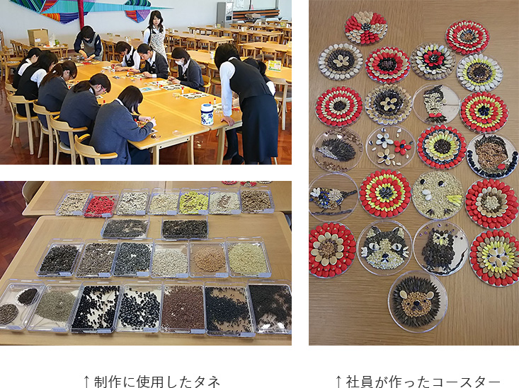 2018年3月14日(水)、15日(木)にタキイ社員を対象とした、2019年版たねぢからカレンダーの表紙を飾る作品の制作会をタキイ種苗本社(京都市)で行いました。9cmシャーレの中に、花や動物、似顔絵などをタネで作成し、各自個性豊かなコースターに仕上げました。