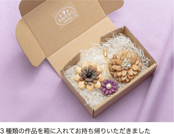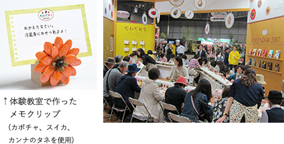 「カボチャ」「スイカ」「カンナ」のタネを使った花モチーフを制作する、1回30分の体験教室を1日10回開き、3日間で約750名の方に作品作りを体験していただきました。