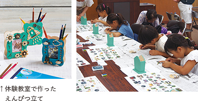 2018年8月3日(金)に京都府立植物園にて、夏休みの子供向けに「たねぢから体験教室」を開催しました。2年目の今回は、えんぴつ立て作りです。既成のえんぴつ立てに思い思いのイメージを膨らませながらタネを選び、ボンドで貼り付けていきます。1時間半ほどで花や昆虫、動物、星やハートなど、様々なデザインの素敵なえんぴつ立てが完成しました。