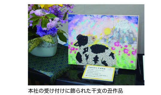 たねぢからプロジェクトのメンバーで「干支」創作を思い立ち、初作品は今年の干支である「丑」を作りました。大きな板を分割して5人で作業を分担し、1つの作品に仕上げました。丑の体に使っているローダンセというモコモコした花のタネと、背景の和紙が絶妙にマッチして、暖かみのある作品に仕上がりました。コロナ禍で様々な制限がある中、共同作品を完成させることができ、喜びもひとしおでした。