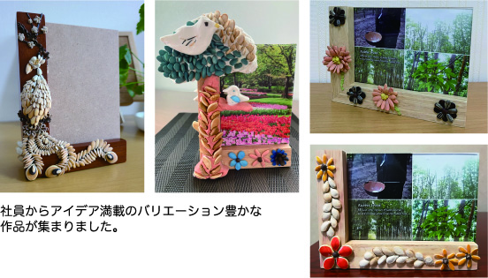 長引くコロナ禍の中、お家時間を少しでも楽しく過ごせるよう、昨年のマルチスタンドキットに続き、たねぢからキット第2弾となる「フォトフレーム制作キット」を社内販売しました。25種類の中から好きなタネを選んで、木製のフォトフレームにそれぞれのデザインで装飾しました。色々な想いがこもった作品は、見ていて心が温まります。たねぢからを通して少しでも楽しい時間づくりのお手伝いができるよう、これからもアイデアを出し合って、さまざまな企画を実現していきたいと思います。