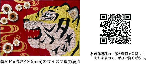 昨年の「丑」作品に続き、2022年の干支である「寅」作品を共同で制作しました。躍動感ある表情で、疫病退散の願いを込めています。また、水は「苦難や災害を流し去る」という意味合いがあるため流水模様を描き、コロナ禍の終息を願い仕上げました。制作に参加したのは年男・年女のタキイ社員で、それぞれタネの貼り付け方や置き方に個性があり、じっくり見ても面白い作品に仕上がっています。