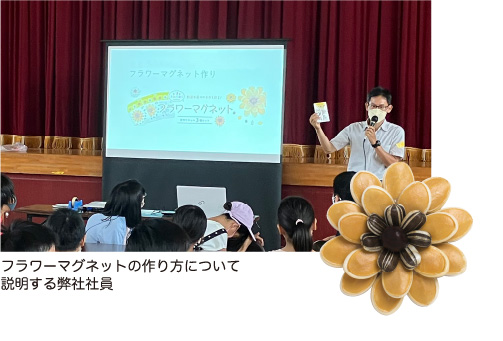 熊本の小学校で、夏休みに保護者会による”学校キャンプ”というイベントがあり、その一環で現地の弊社社員による「たねぢからのフラワーマグネット作り」の体験会を行いました。当日は70人の子供たちと50人の保護者に参加いただきました。普段は賑やかな子供達が、とても静かに集中してオリジナリティー溢れる作品を一生懸命作っていました。保護者の方からも「普段は接する機会が少ないタネに触れることができて大変勉強になった」と満足のお言葉をいただきました。