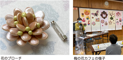 2019年に閉校になった、京都市内の元梅涇中学校を活用した、いつでも誰でも集える健康長寿サロン『梅の花カフェ』にて、たねぢからのワークショップを開催しました。今回は「タネで作る花のブローチ」を作成。当日は18名の参加者があり、開催場所となった教室は満席でした。タネそのものに興味を持たれる方も多く、和気あいあいとした雰囲気の中、あっという間に素敵なブローチが完成しました。