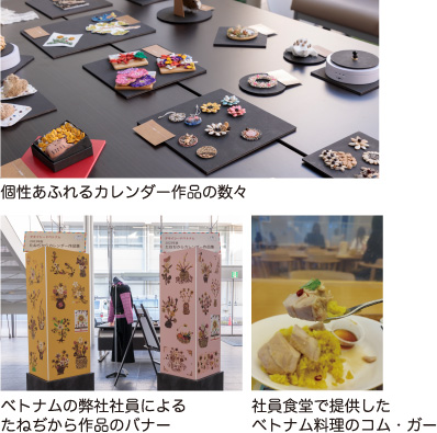 11月下旬に「2023年版たねぢからカレンダー」の作品展示と「ベトナムフェア」をタキイ本社で同時開催しました。今回は国内だけでなく、ベトナムで働いている弊社社員より、繊細で情緒あふれる作品が多数届きました。国内からも独創的で、制作者の人柄がにじみ出る作品が多く集まり、ほっこりしたたねぢからワールドを展開することができました。たねぢからは、国内だけでなく海外の方たちとも言語を超えてつながることができるアイテムだと改めて実感しました。
