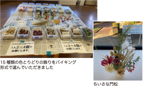 京都府立植物園でも制作した「ちいさな門松」を社内販売しました。年末のゆったりした時間に、家族で楽しんで作ってもらえたようで「色々なタネを見たり触ったりするだけで、子供の目がキラキラしていました」「予想以上に本格的で、手芸好きの祖母も大満足!」「ゴージャスで部屋が明るくなったようです」など、嬉しい感想と写真がたくさん届きました。両親や友達へのプレゼントにも喜ばれ、たくさんの笑顔の輪が広がりました。