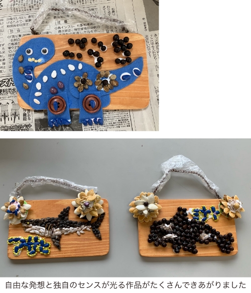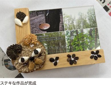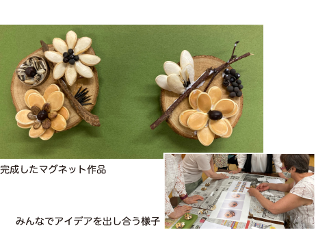 7月19日(水)に『梅の花カフェ』で、「たねぢからマグネット」を作成しました。各自、好きなタネや木の装飾材料を選んで自由にレイアウトしてもらいました。皆さんは地域の方で10年以上もお付き合いのあるお友達どうし。作品を作りながら会話もはずんで、暑さを吹き飛ばすくらい笑い溢れる楽しい時間になりました。