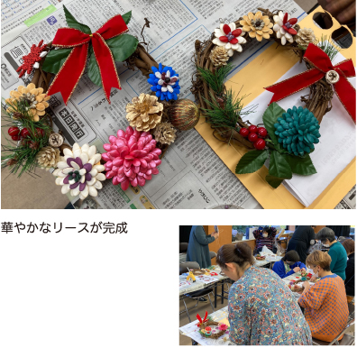 11月30日(水)に『梅の花カフェ』で、たねぢからのワークショップを開催しました。今回は「クリスマス&お正月飾り」を作成。前回9月にもご参加いただいたリピーターの方が半数以上を占め、たねぢからを楽しみにしてくださっていることを実感しました。今回の作品は、クリスマスからお正月まで長い期間飾れるので、「早速今日から飾るよ」「季節によって他のものを足して飾ってみる」など、皆さま思い思いの飾り方を楽しんでおられました。