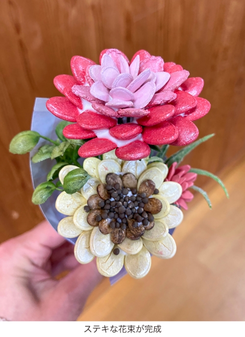 3月27日(水)に『梅の花カフェ』で、たねぢからのワークショップを開催しました。今回は「たねぢからフラワー」を作成。3種類のいろどり鮮やかなフラワーが完成したら、最後は可愛くラッピングして小さな花束が完成!手のひらに収まる可愛い花束に、皆さん大喜びでした。