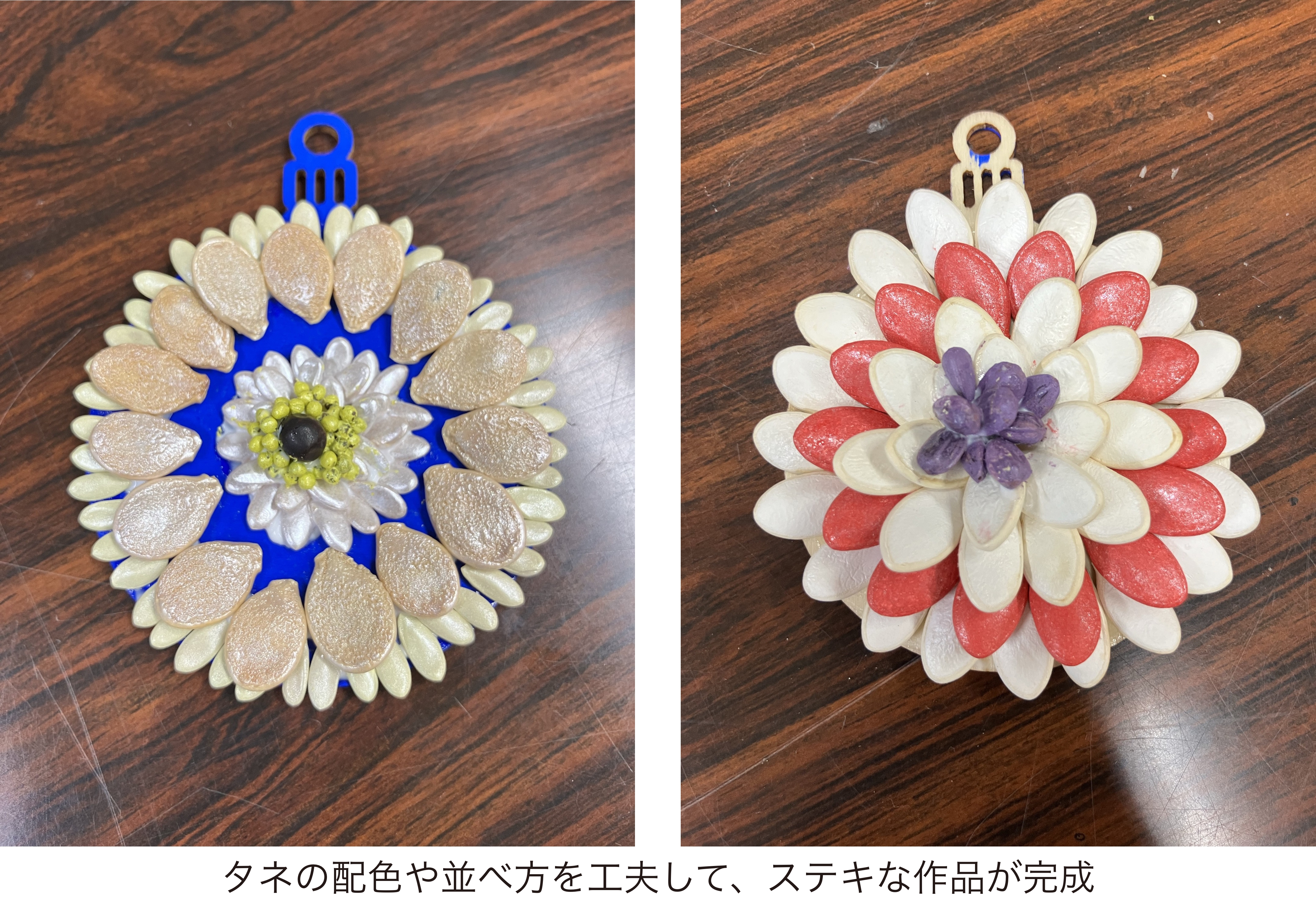 カボチャ、ヒマワリ、カンナのタネを使った花モチーフを制作する、