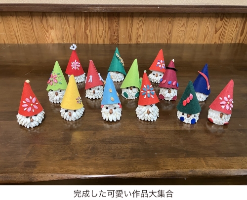 11月27日(水)に『梅の花カフェ』で、クリスマスシーズンに合わせた「西洋の妖精ノーム作り」に挑戦。ノームとは、ヨーロッパの民間伝承とおとぎ話にでてくる妖精で、現地ではクリスマスの時期によく飾られます。それぞれの机で思い思いの帽子デザインや、目や鼻にするタネを選ぶ楽しそうな会話が聞こえてきました。